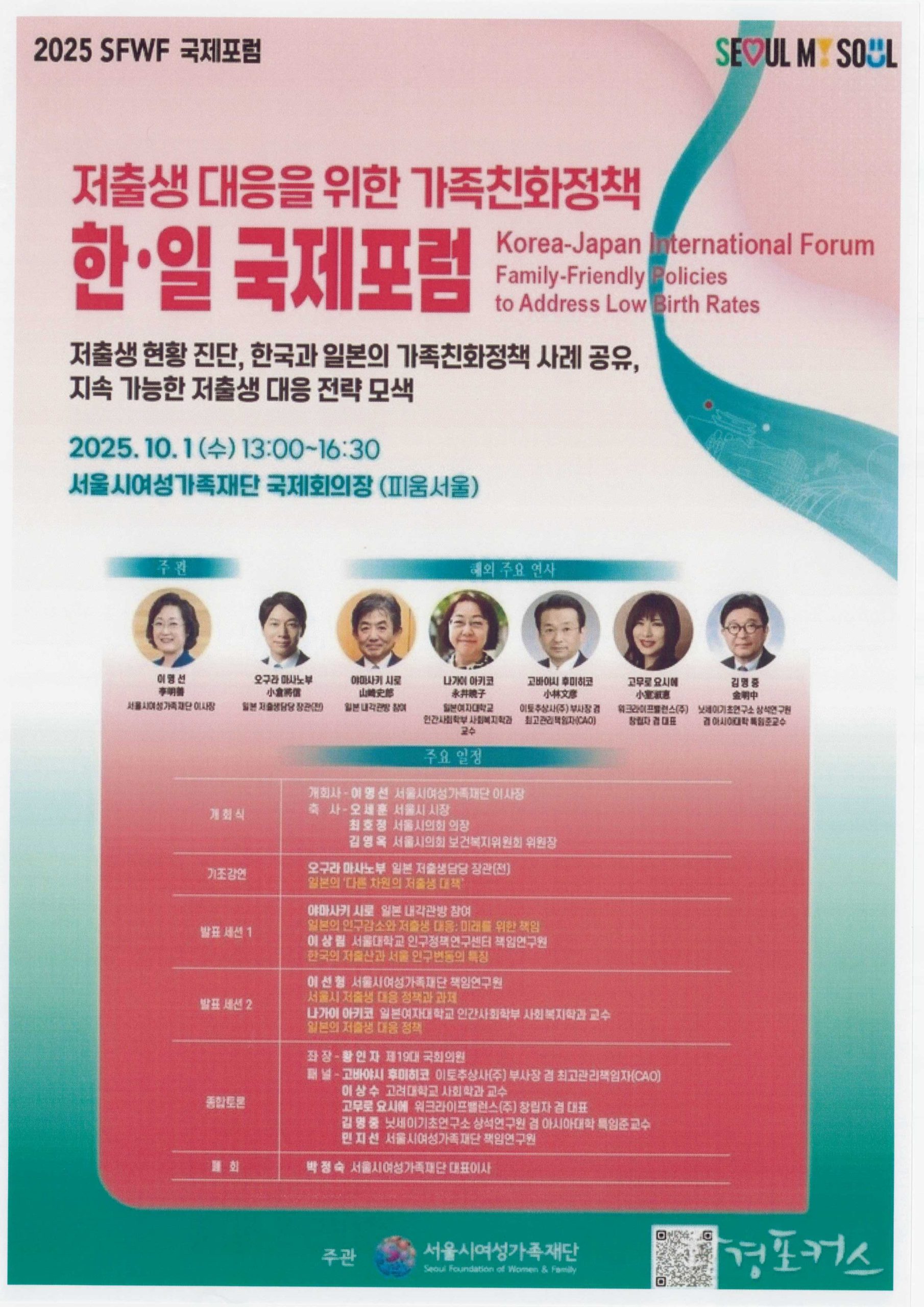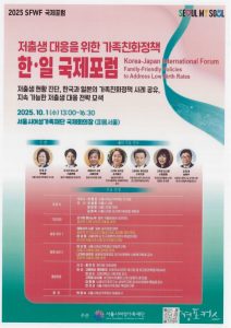 2025年10月1日に ソウル市女性家族財団 国際会議場で 韓・日 国際フォーラムが開催され、永井暁子所長が登壇しました。 「少子化対応のための家族親和(家族にやさしい)政策」と題して、少子化現状診断、韓国と日本の家族親和政策事例共有、持続可能な少子化対応戦略模索が行われました。主催は、李明善(ソウル市女性家族財団理事長)。