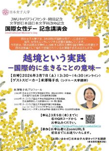 3月8日は「国際女性デー」です。 日本女子大学では、毎年「国際女性デー」に合わせて、女性をエンカレッジする企画を実施しています。今年度は、日本語教員として海外で活躍されている卒業生の米澤陽子氏をお迎えします。